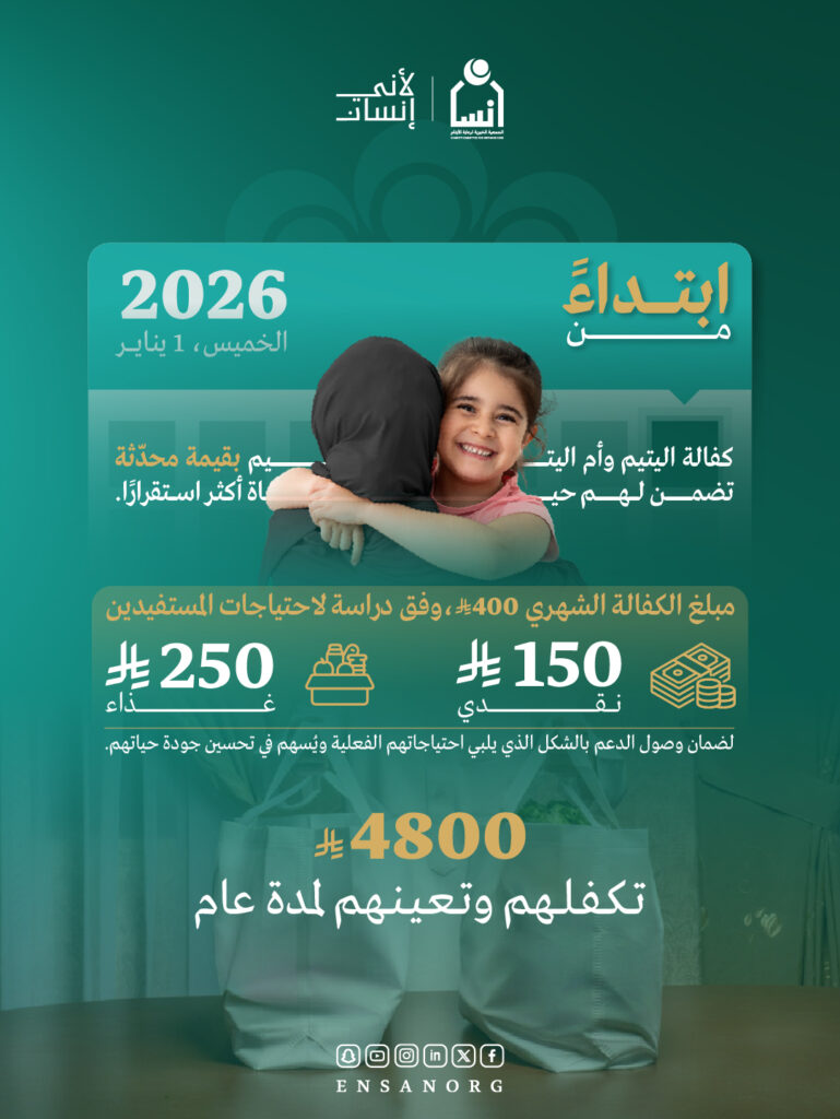وأكد المحارب أن قرار رفع الكفالة ينسجم مع الهدف الاستراتيجي للجمعية القائم على تعزيز الاستقرار الأسري لأبناء إنسان، وتوفير دعم يتناسب مع احتياجاتهم الأساسية، بما يضمن لهم حياة كريمة ويعزز قدرتهم على مواجهة التحديات المعيشية.